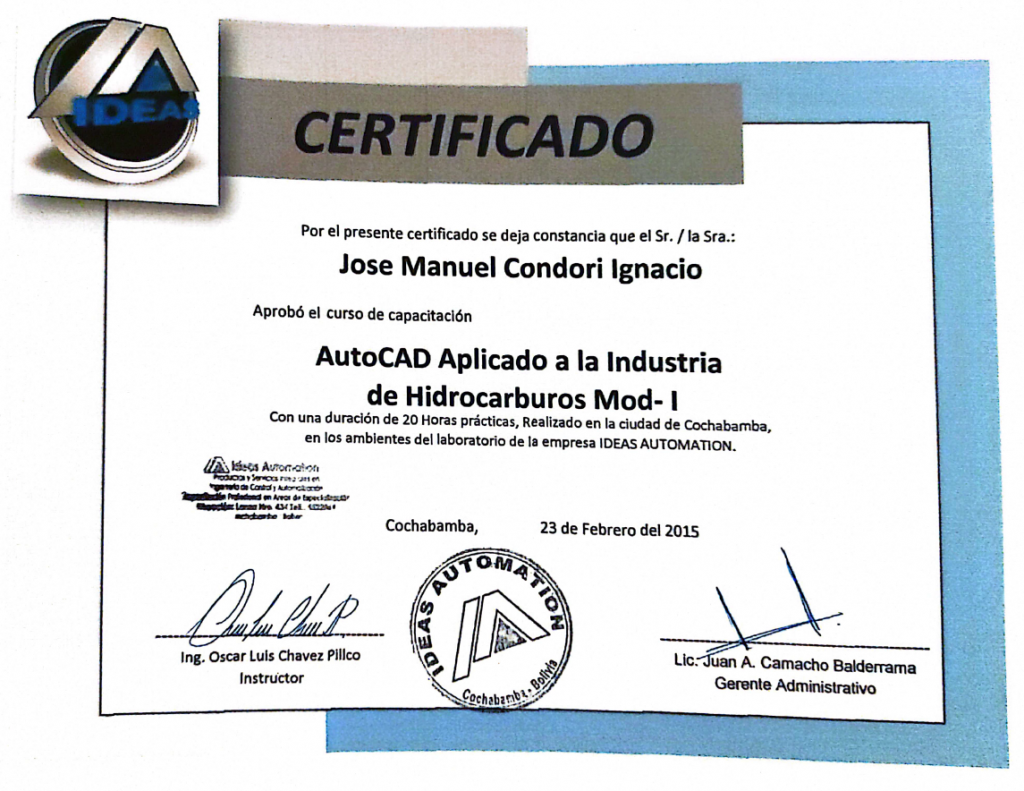 Jose Manuel Condori IgnaciomvaldezUncategorized Sin comentarios 23FebShareCurso aprobado: AutoCAD Aplicado a la Industria de Hidrocarburos Mod-I Next Felipe Mamani Acuña15 junio, 2016You Might Also Like Wilson Ramírez Romero OscarCastro Sin comentarios Simón Pedro Quispe Condori OscarCastro Sin comentarios Rubén Ronald Veizaga Zamudio OscarCastro Sin comentarios Roly Alberto Chacapecho Molle OscarCastro Sin comentarios Rolando Javier Antezana Romero OscarCastro Sin comentarios Jhonny Huarachi Guzman OscarCastro Sin comentarios