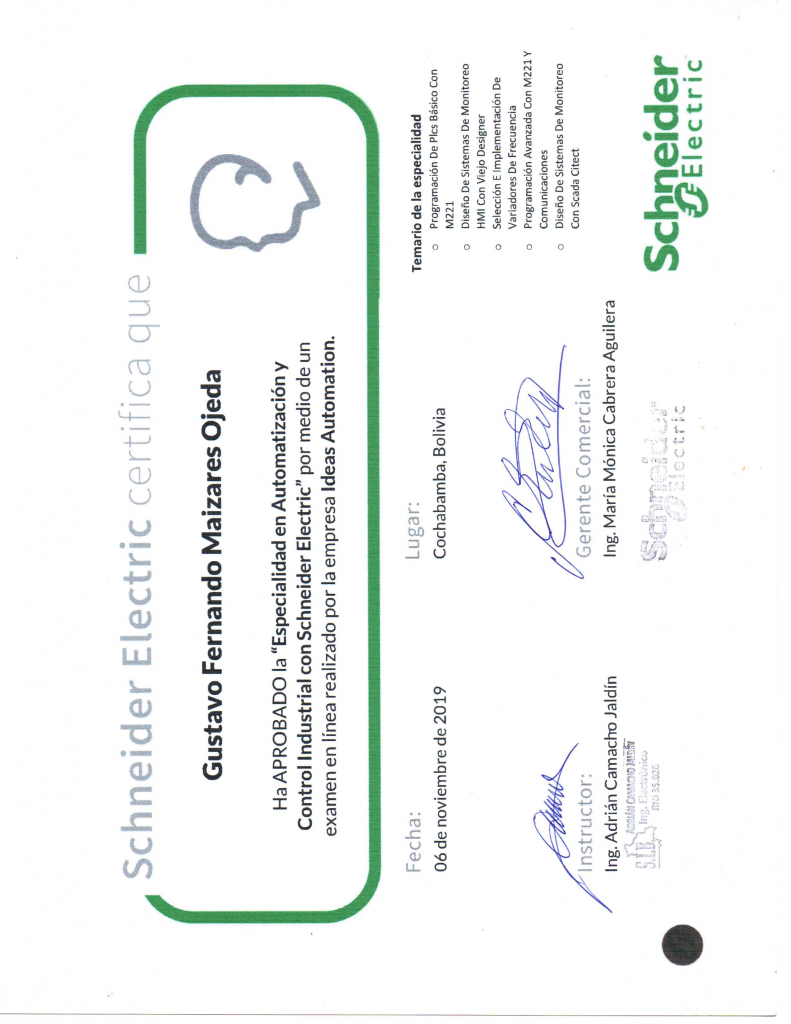 Gustavo Fernando Maizares OjedaGabriela ValenciaUncategorized Sin comentarios 06NovShareDescargar certificado en PDFDescarga Previous Descargar EcoStruxture Machine Expert Basic1 noviembre, 2019 Next Alvaro Cristhian Callejas Mariaca6 noviembre, 2019You Might Also Like Wilson Ramírez Romero OscarCastro Sin comentarios Simón Pedro Quispe Condori OscarCastro Sin comentarios Rubén Ronald Veizaga Zamudio OscarCastro Sin comentarios Roly Alberto Chacapecho Molle OscarCastro Sin comentarios Rolando Javier Antezana Romero OscarCastro Sin comentarios Jhonny Huarachi Guzman OscarCastro Sin comentarios