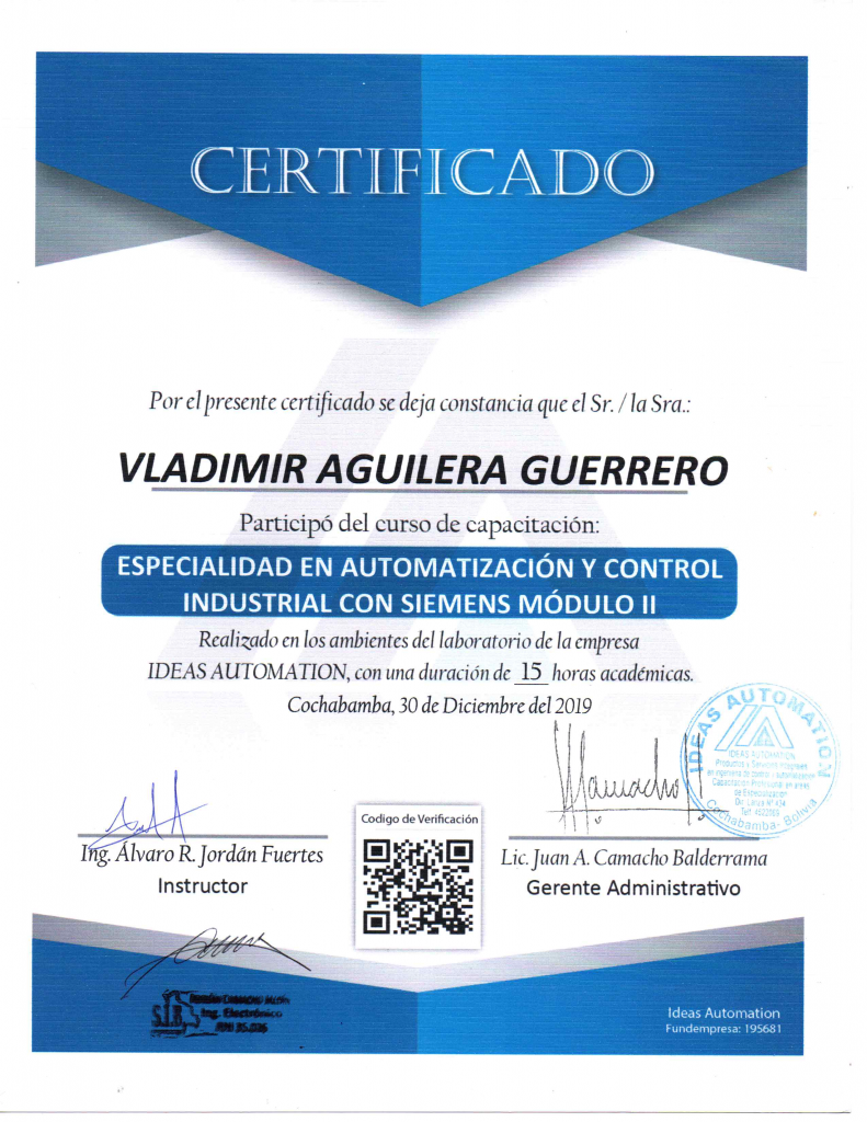 Vladimir Aguilera GuerreroGabriela ValenciaUncategorized Sin comentarios 30DicShareDescargar certificado en PDFDescarga Previous Roberto Carlos Orellana Santos30 diciembre, 2019 Next Participantes Diseño de planos para la Automatización – AutoCAD Electrical Modulo 2 avanzado (Presencial 11/2019)30 diciembre, 2019You Might Also Like Wilson Ramírez Romero OscarCastro Sin comentarios Simón Pedro Quispe Condori OscarCastro Sin comentarios Rubén Ronald Veizaga Zamudio OscarCastro Sin comentarios Roly Alberto Chacapecho Molle OscarCastro Sin comentarios Rolando Javier Antezana Romero OscarCastro Sin comentarios Jhonny Huarachi Guzman OscarCastro Sin comentarios