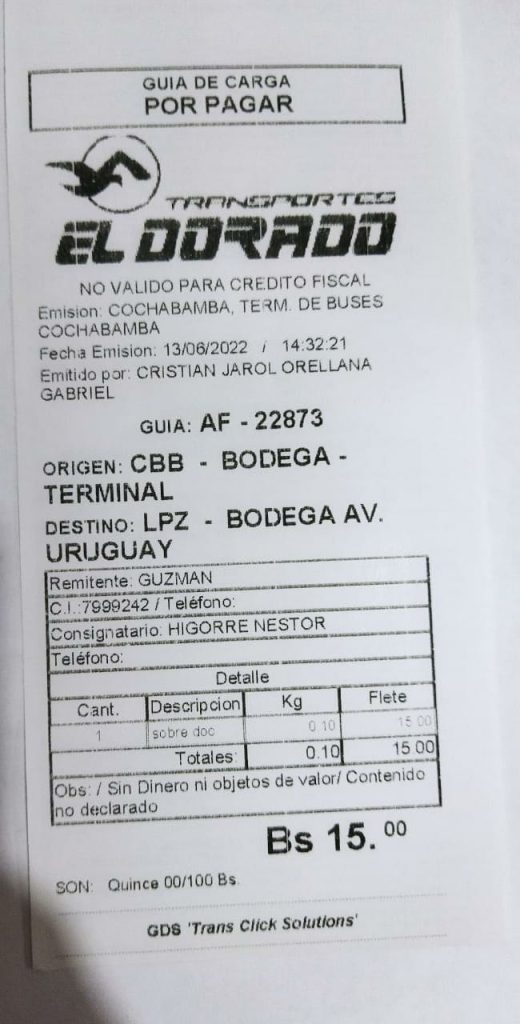 El certificado fue enviado por transporte terrestre en fecha 13/06/2022 mediante Flota el dorado, se adjunta numero de gúia