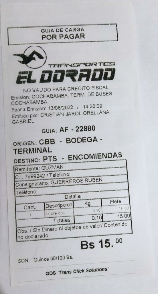 El certificado fue enviado por transporte terrestre en fecha 13/06/2022 mediante Flota el dorado, se adjunta numero de gúia