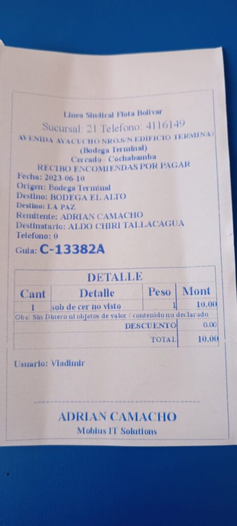 El certificado fue enviado por transporte terrestre en fecha 10/06/2023 mediante Flota “Bolivar”, se adjunta numero de guía