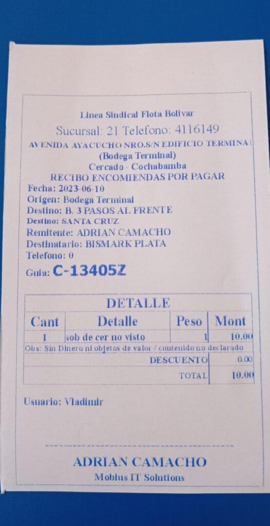 El certificado fue enviado por transporte terrestre en fecha 10/06/2023 mediante Flota “Bolivar”, se adjunta numero de guía