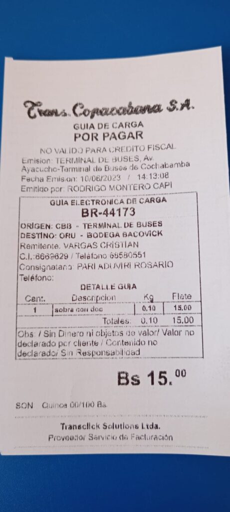 El certificado fue enviado por transporte terrestre en fecha 10/06/2023 mediante Flota “Trans Copacabana S.A.”, se adjunta numero de guía