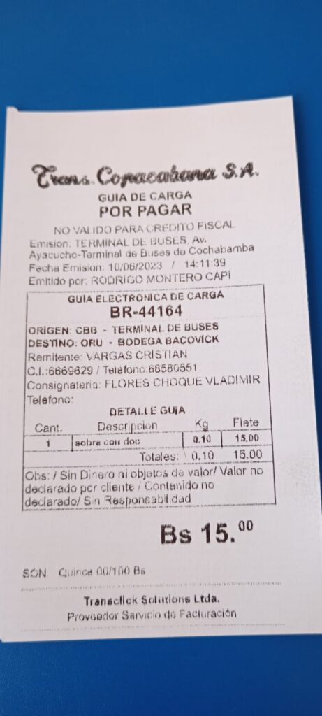 El certificado fue enviado por transporte terrestre en fecha 10/06/2023 mediante Flota “Trans Copacabana S.A.”, se adjunta numero de guía