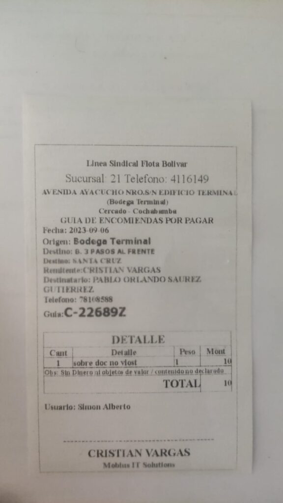 El certificado fue enviado por transporte terrestre en fecha 9/06/2023 mediante Flota “Bolivar”, se adjunta numero de guía