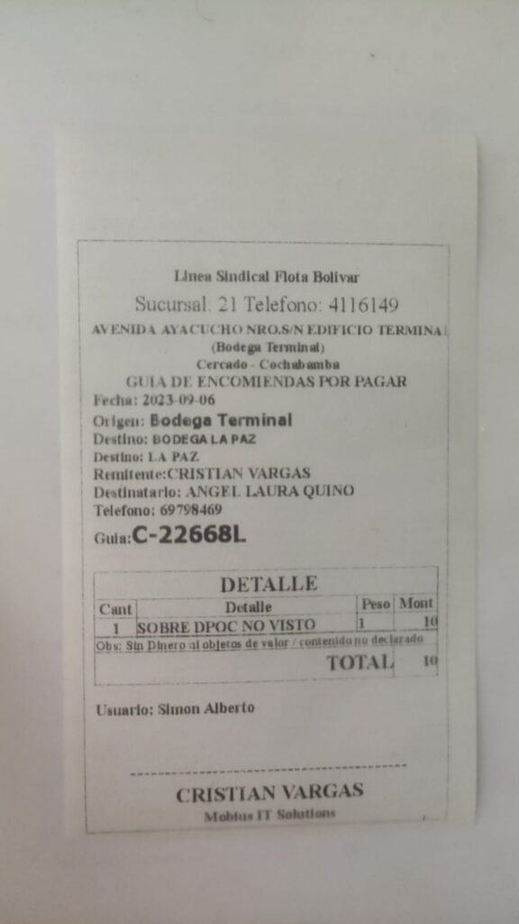 El certificado fue enviado por transporte terrestre en fecha 6/09/2023 mediante Flota “Bolivar”, se adjunta numero de guía