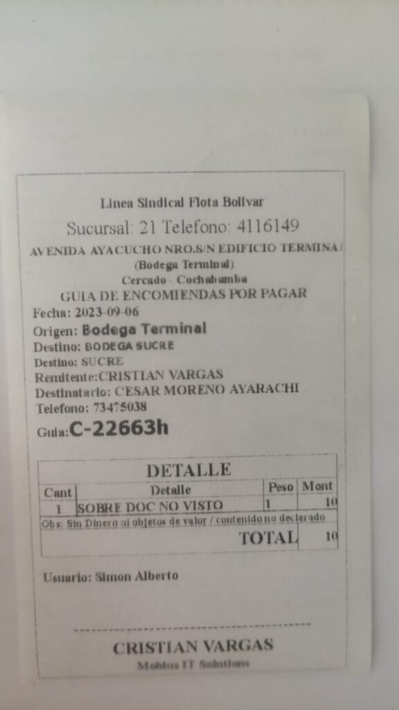 El certificado fue enviado por transporte terrestre en fecha 6/09/2023 mediante Flota “Bolivar”, se adjunta numero de guía