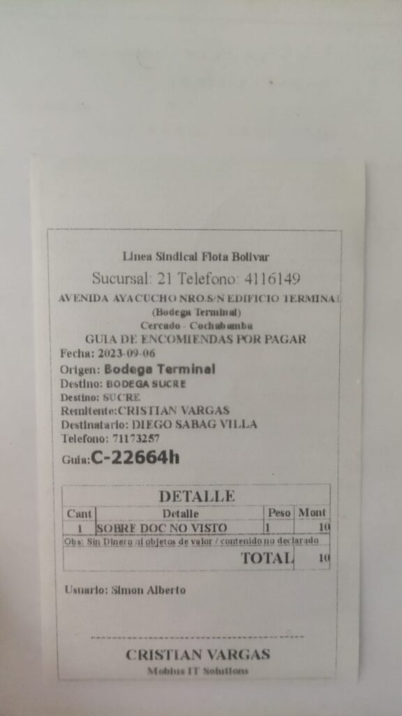 El certificado fue enviado por transporte terrestre en fecha 6/09/2023 mediante Flota “Bolivar”, se adjunta numero de guía