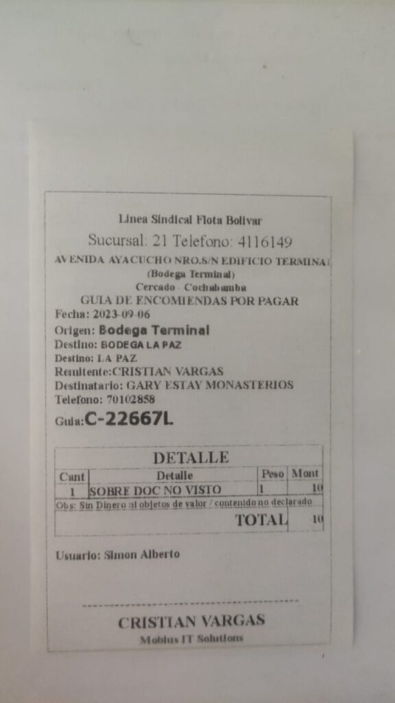 El certificado fue enviado por transporte terrestre en fecha 6/09/2023 mediante Flota “Bolivar”, se adjunta numero de guía