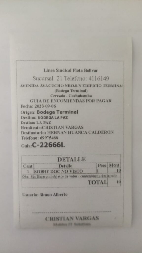 El certificado fue enviado por transporte terrestre en fecha 6/09/2023 mediante Flota “Bolivar”, se adjunta numero de guía