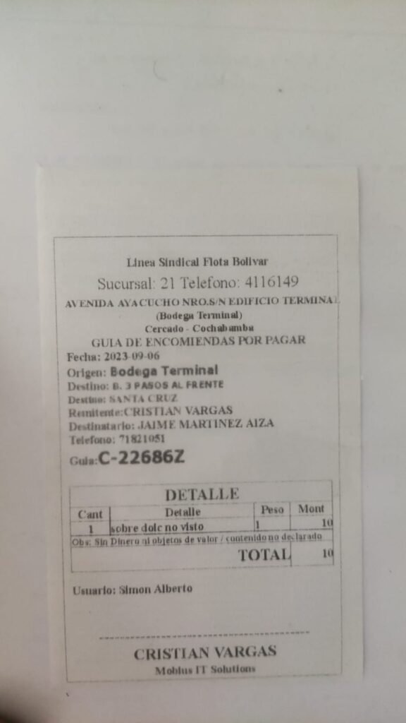 El certificado fue enviado por transporte terrestre en fecha 6/09/2023 mediante Flota “Bolivar”, se adjunta numero de guía